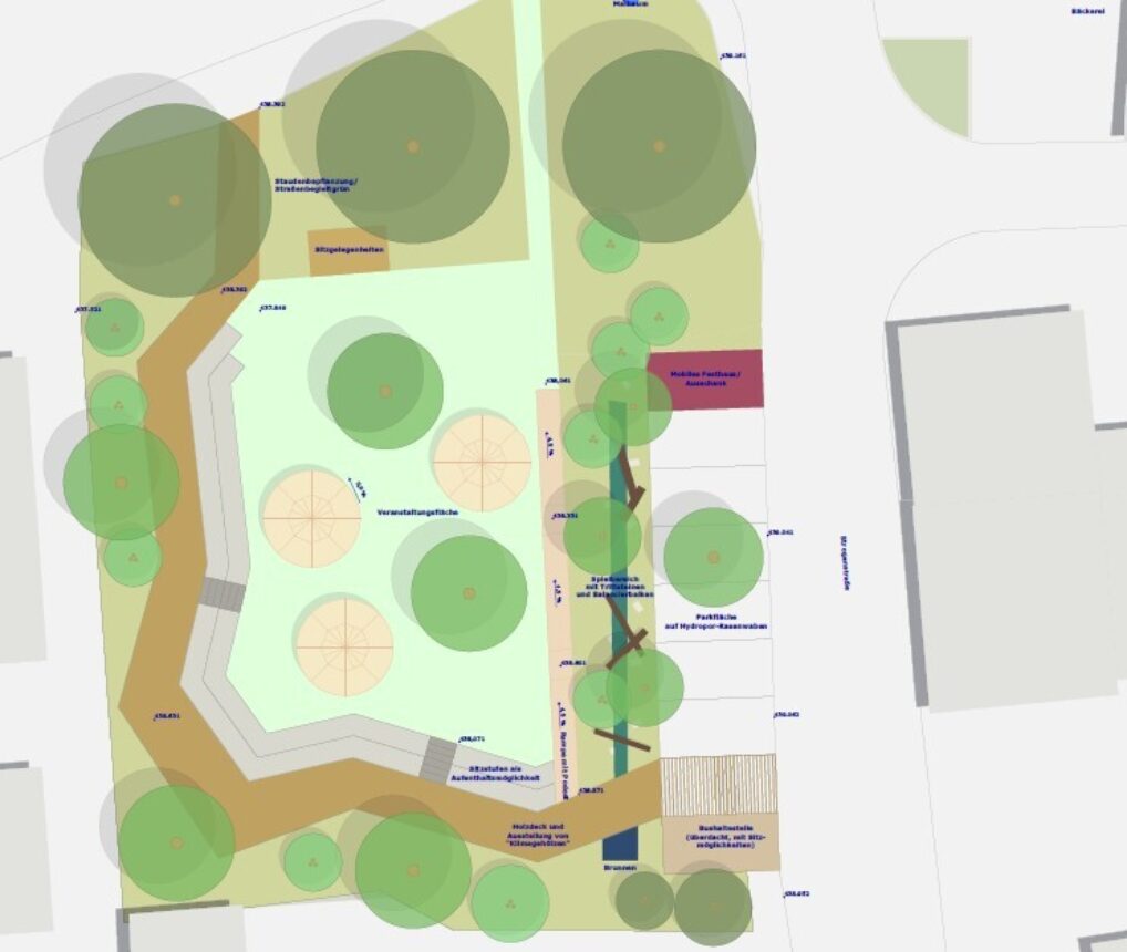 Im Zuge der Entwurfsplanung wurde eine umfassende Entsiegelung der Fläche geplant und die neu gewonnenen Flächen mit verschiedenen Laubgehölzen und Stauden beplant. Für die Gemeinde Fraunberg war außerdem der Umgang mit der Ressource Wasser sowohl als ästhetisches Element, als auch im Bezug auf ein nachhaltiges Niederschlagswassermanagement von Bedeutung. Durch den gesteigerten Anteil der Vegetationsflächen und die Integration von Mulden wurde die Möglichkeit geschaffen, das Niederschlagswasser auf der Fläche zu halten und zu versickern. Ein Brunnen im Nordwesten der Fläche und Sitzstufen im Süden und Westen des Platzes laden zum Verweilen ein. Jung und Alt können an verschiedenen Balancierelementen ihr sportliches Können testen. Für die Gemeinde sollte die Fläche weiterhin für Veranstaltungen zur Verfügung stehen. Auch die Möglichkeit des Kurzzeitparkens auf Rasenwaben wurde der vorherigen Nutzung des Gebietes gerecht. Durch die Bushaltestelle im östlichen Bereich des Platzes wurde die Anbindung an das ÖPNV-Netz gesichert und ein sicherer Wartebereich für Schulkinder und Wartende geschaffen. Ein insektenfreundliches Beleuchtungskonzept fördert zudem ein umweltverträgliches Sicherheitsgefühl bei Dunkelheit. Das Mobiliar wurde neben Ladesäulen für E-Bikes und Fahrradanlehnbügeln weiterhin mit einem Trinkbrunnen ergänzt.
